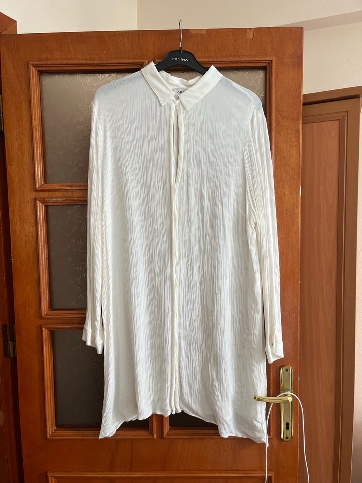 Linen kumaştan yapılmış, pileli dokulu, uzun kollu, yakalı ve bol kesim beyaz kadın gömleği. Ofis için uygun, bohem Paris tarzında.