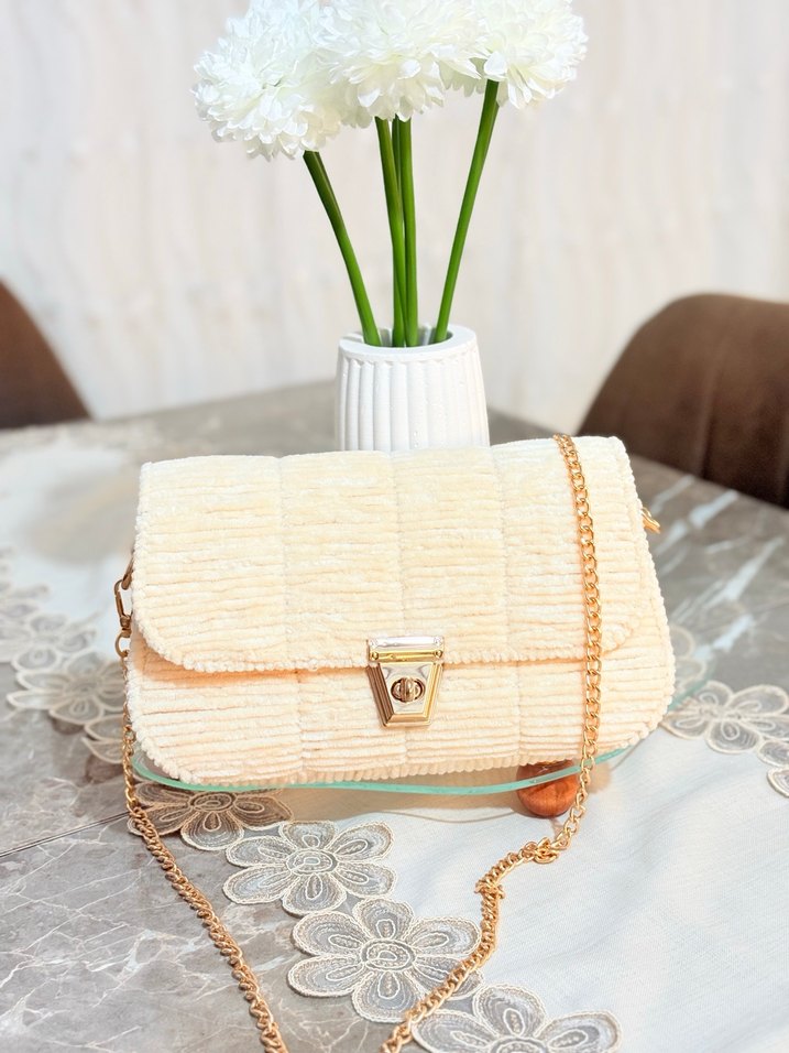 Beyaz pilili sentetik kumaştan yapılmış, ince desenli, altın zincir askılı klasik şıklıkta kadın çantası.