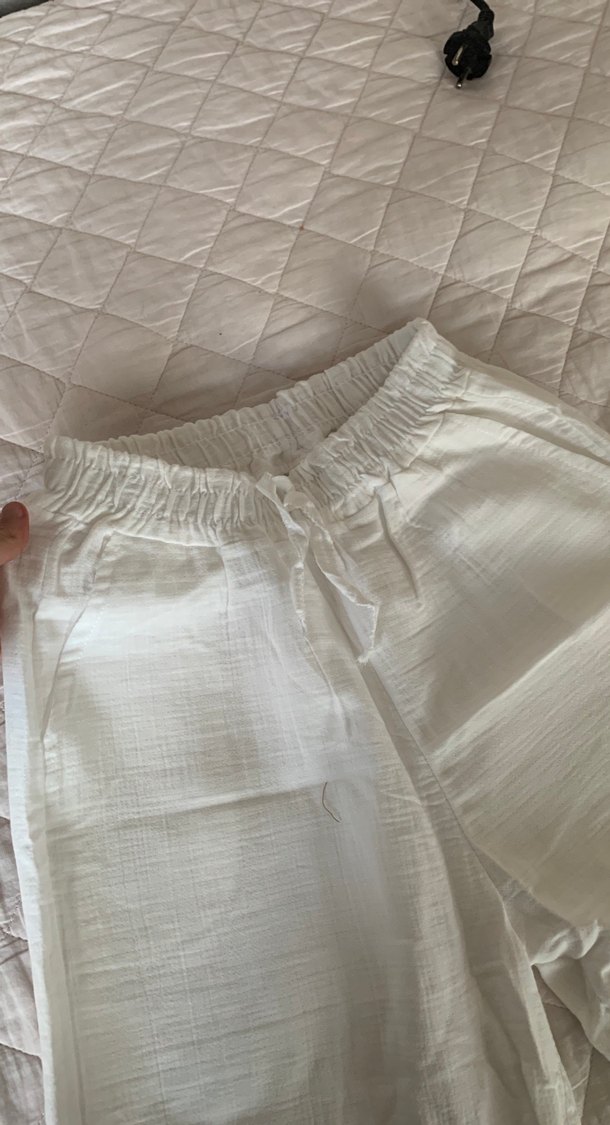 hiç giymedim paça terzilik işi var Kadın keten pantolon, pilili ve bol kesimdir. Midi boyda, lastikli ve bağcıklı bel ile rahatlık sağlar. Günlük kullanıma uygun sade beyaz tasarımdır.