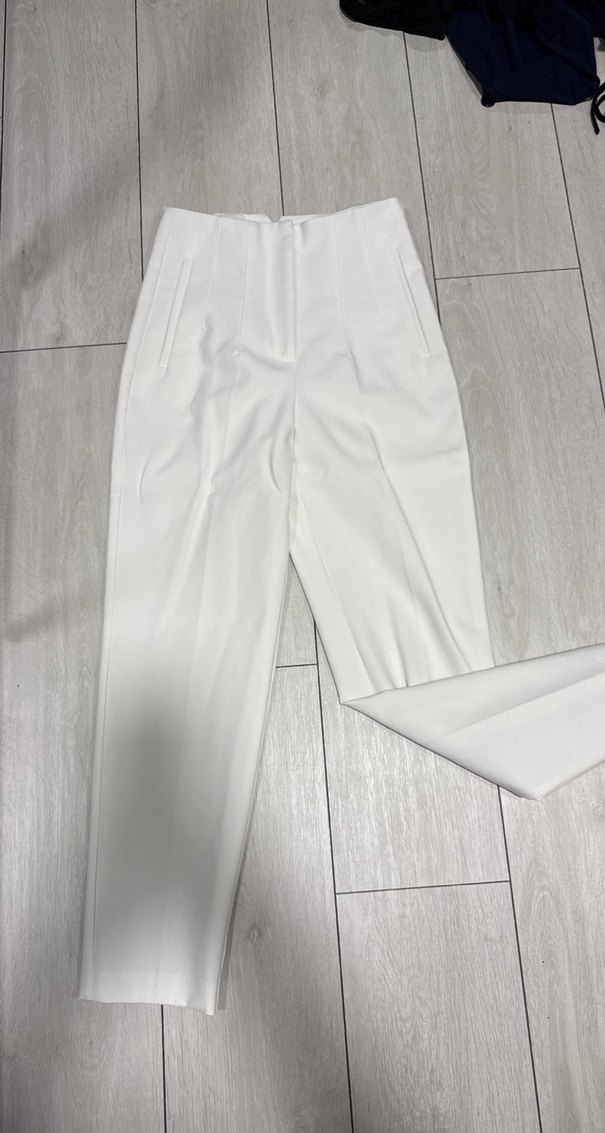 Beyaz, pilili ve normal boy midi kadın kumaş pantolon. Düz kesim ve iş ortamına uygun şık tasarım.