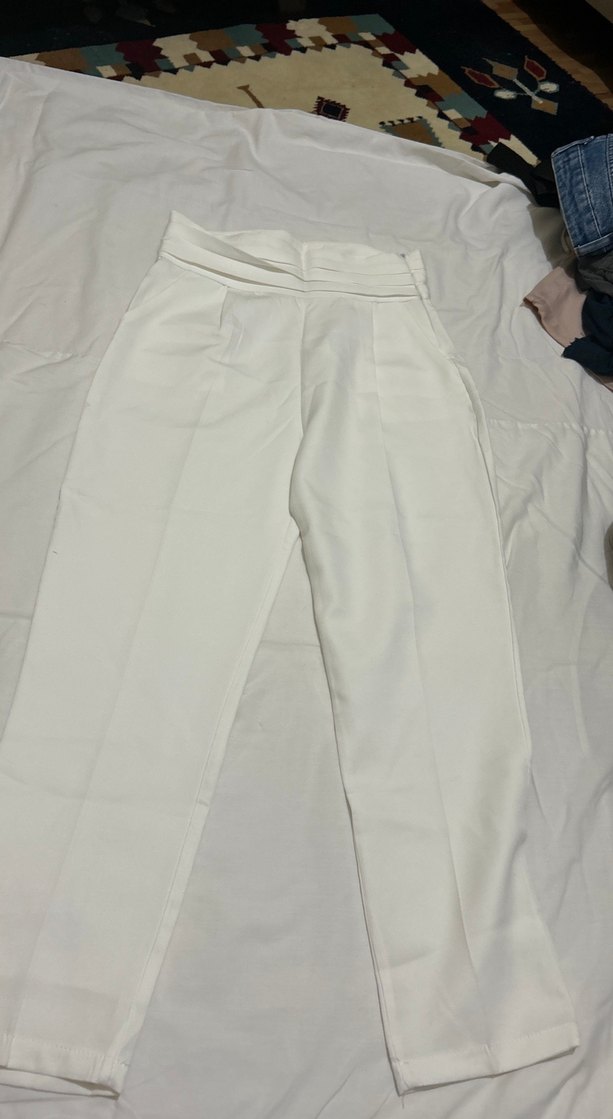 Beyaz renkli, pilili ve midi boy kadın kumaş pantolon. Rahat kesimli ve sentetik dokulu, minimalist sokak stiline uygun, ofis kullanımı için ideal.