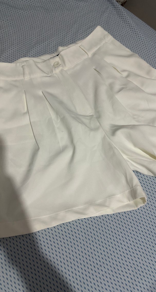 Beyaz, pilili, midi boy, bol kesim kadın kumaş şort pantolon, minimal tarzda