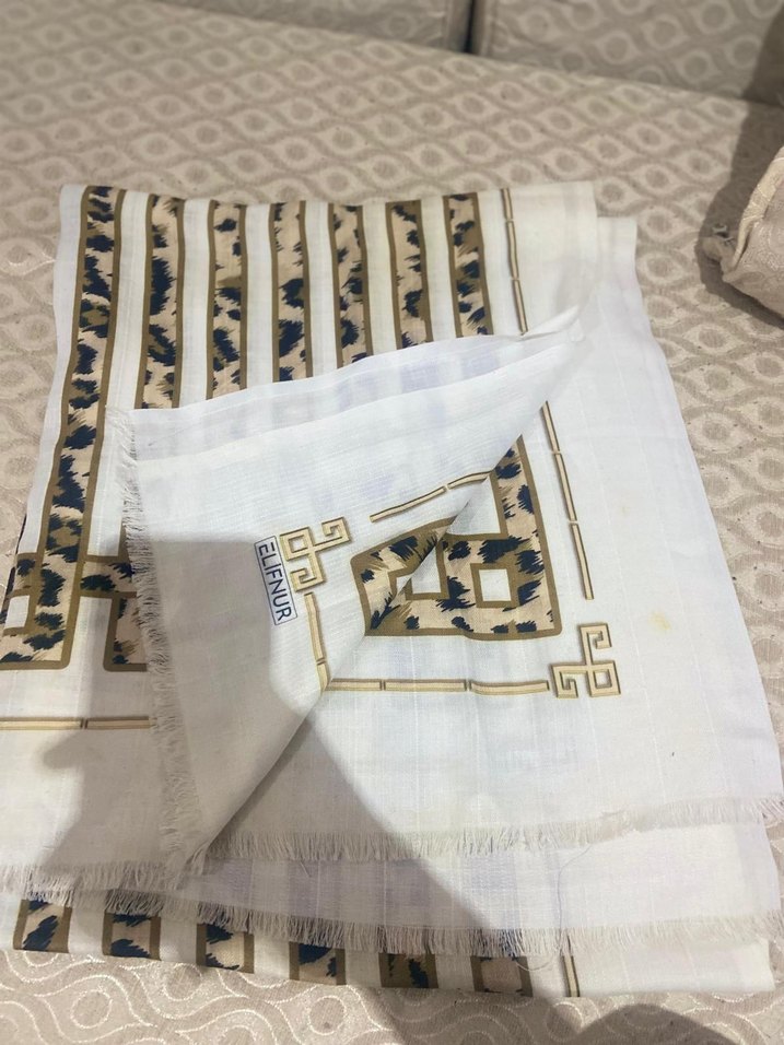 Beyaz renkte, pilili ve bohem desenli kadın şalı. Yumuşak sentetik kumaştan, mütevazı stile uygun.