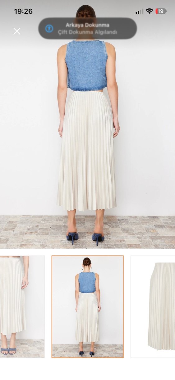Beyaz, uzun pilili etek, bol kesim ve yumuşak sentetik kumaştan yapılmıştır. Ofis için uygun çağdaş minimalist tarza sahiptir. Yalnızca bir defa giyildi hiç bir deformasyon yoktur