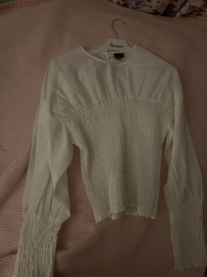 Beyaz keten kumaştan, uzun kollu, yuvarlak yaka ve pilili detaylara sahip. Hiç giyilmedi hediye geldi