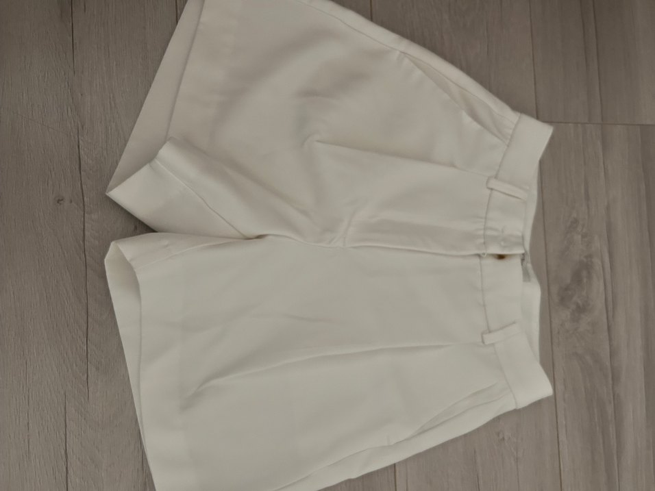 Beyaz, pilili, kısa kadın kumaş şort. Regular fit, sentetik kumaştan, minimalist ve sade tarzda, günlük kullanıma uygun.