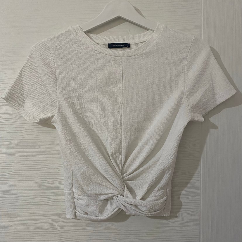 Yumuşak keten kumaştan, kısa kollu, pilili detaylı beyaz fitted tişört, yuvarlak yaka ve günlük sokak stili için uygun.
