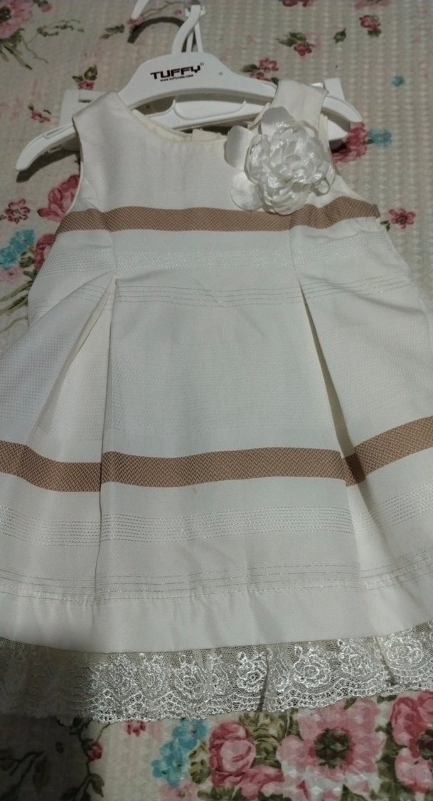 Beyaz renkli, pilili ve nakış detaylı kız elbisesi. Kayık yaka ve askılı, bol kesim modern klasik tasarım.