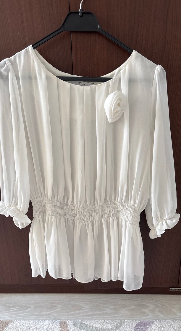Beyaz pilili, kısa kollu, yuvarlak yakalı ve bol kesimli keten kumaştan yapılmış, modern klasik tarzda bir bluz. Düğünler için uygun şık bir model. Orjinal