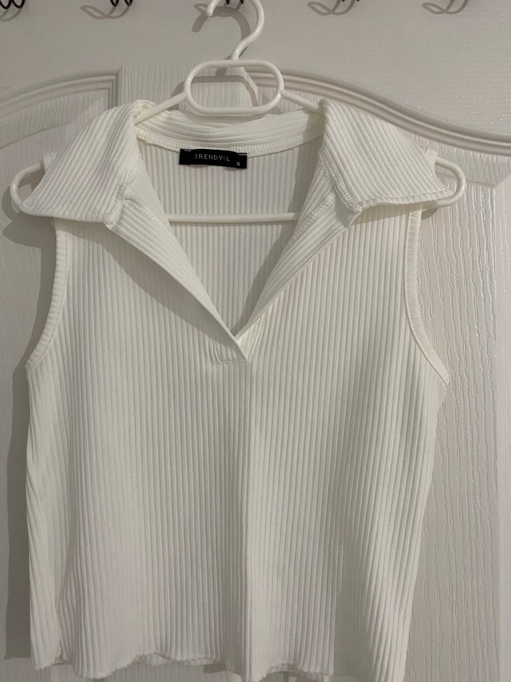 Beyaz pilili kolsuz gömlek, yakalı ve fitted kesimdir. Hafif sentetik kumaştan yapılmıştır, günlük şıklık için uygundur.