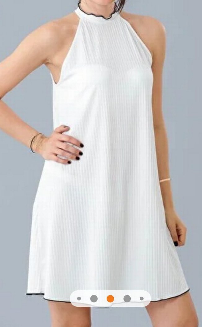 Beyaz renkte, yüksek yakalı ve pilili tasarıma sahip kolsuz midi elbise. Yumuşak sentetik kumaştan, rahat ve salaş kesim, minimalist sokak stili için uygundur. İç gösterdiği için giyemedim. O yüzden durumu iyi. Astar ile giyilebilir veya ev / yazlık için uygun olabilir.
