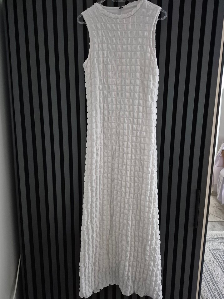 Beyaz uzun içi astsrlı elbise, yüksek yakalı ve pilili dokusuyla dikkat çekiyor. Kolsuz ve normal kesimdir, minimalist tarz için uygundur.