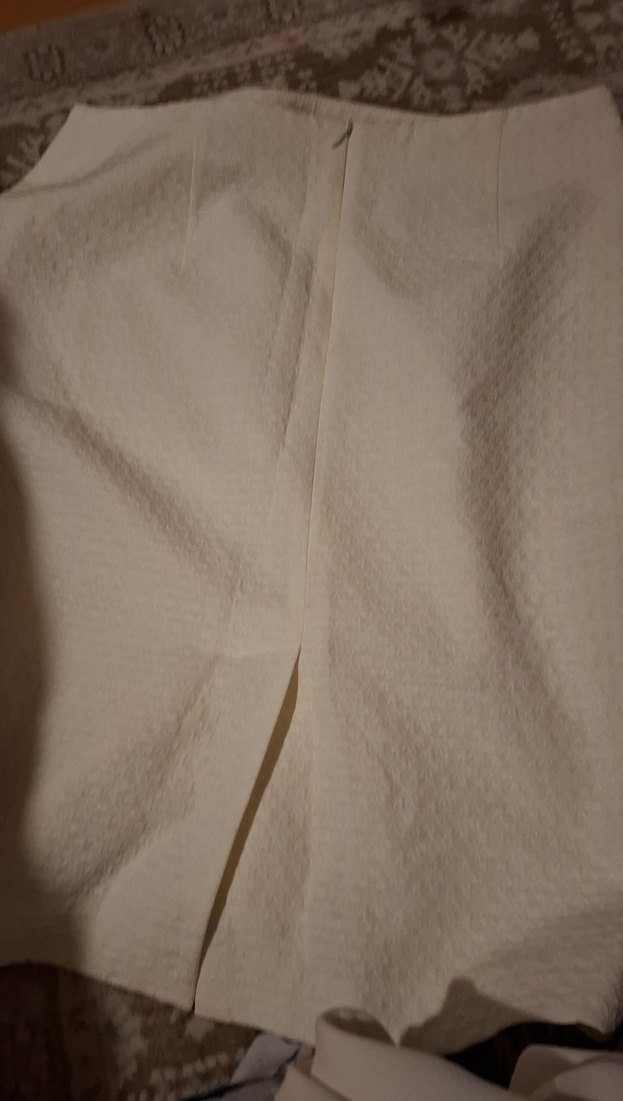 Yumuşak keten kumaştan yapılmış, pilili ve vücuda oturan beyaz midi hamile eteği. Ofis kullanımı için uygundur. ✨