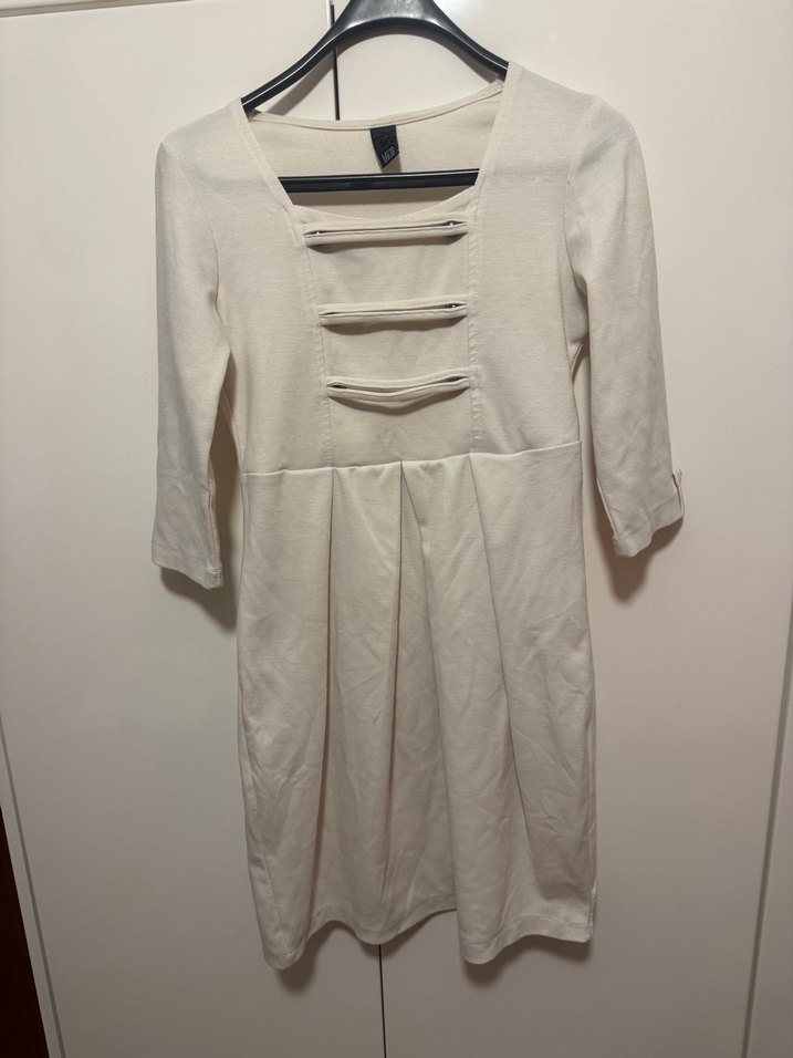 Beyaz renkli, pilili ve V yaka detaylı, üç çeyrek kollu midi elbise, kalin penye kumaştan üretilmiştir.