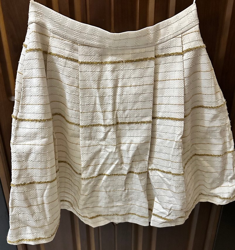 Beyaz renkli keten kumaştan, pilili ve bol kesim midi etek. Parlak dokusu ve bohem Paris tarzıyla ofis kullanımına uygundur. Hiç giyilmemiştir.