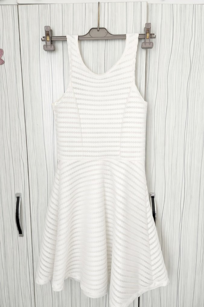 Beyaz renkli, kolsuz ve pilili midi elbise. Sentetik kumaştan, sade ve şık tasarımıyla günlük kullanıma uygundur.