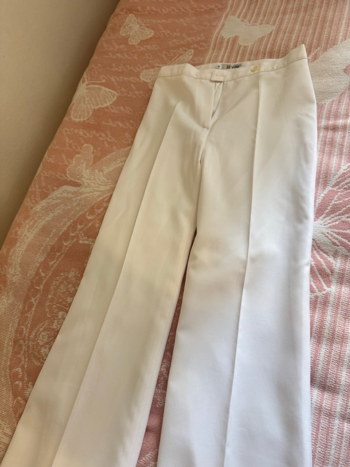 Beyaz, midi boy, pilili ve normal kesim kumaş pantolon. İpek gibi yumuşak dokusu ve klasik zarafet stiline uygun, ofis kullanımı için ideal.
