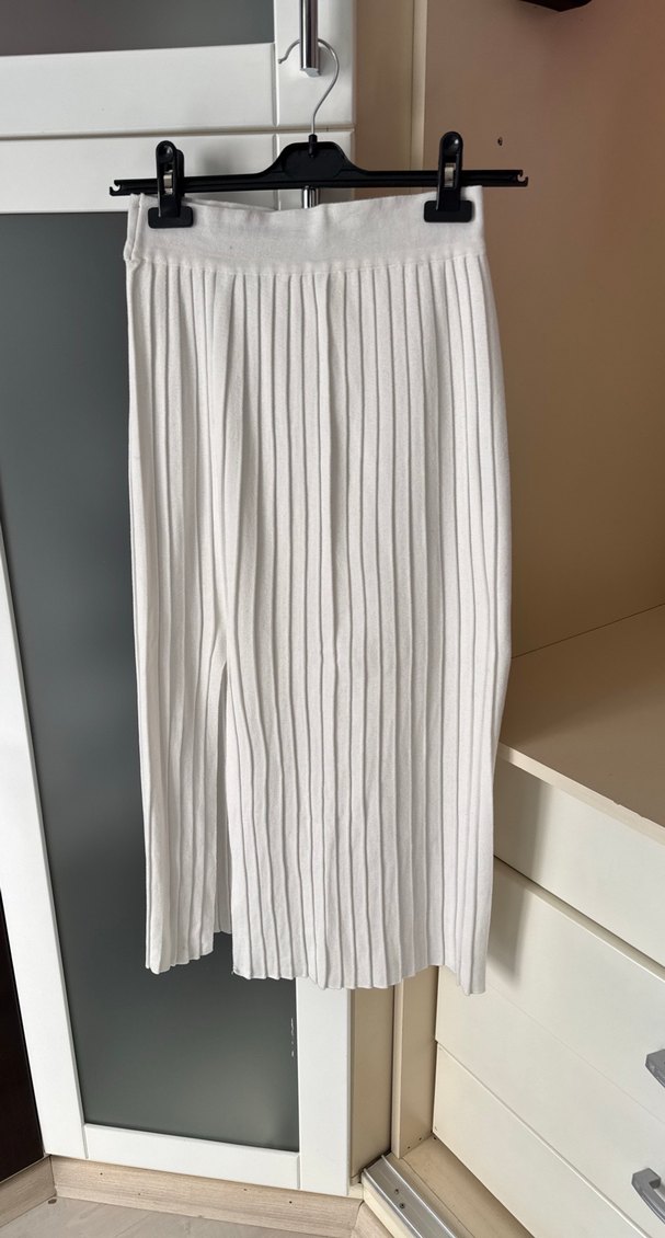 Beyaz pilili midi etek, yumuşak triko kumaştan ve normal kesimlidir. Minimalist normcore tarzıyla günlük kullanıma uygundur. Tam boy 86 cm, yırtmaç boy 42 cm.