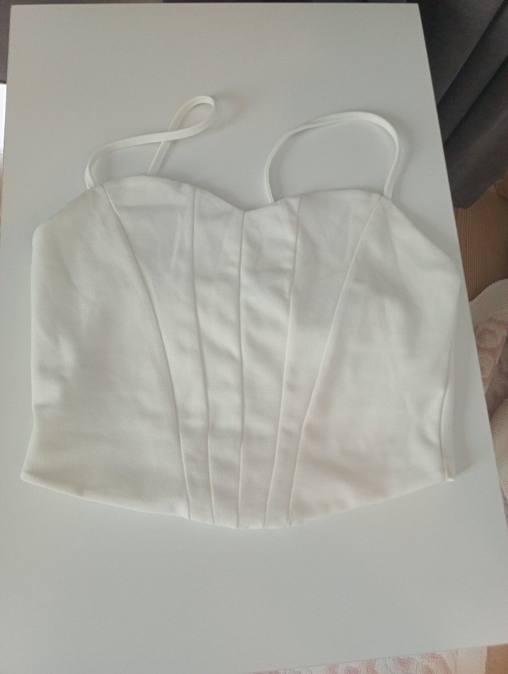 1 kez giydim tertemz pilili detaylara ve ince askılara sahip beyaz, vücuda oturan mini büstiyer. Günlük sokak stili için uygun.
