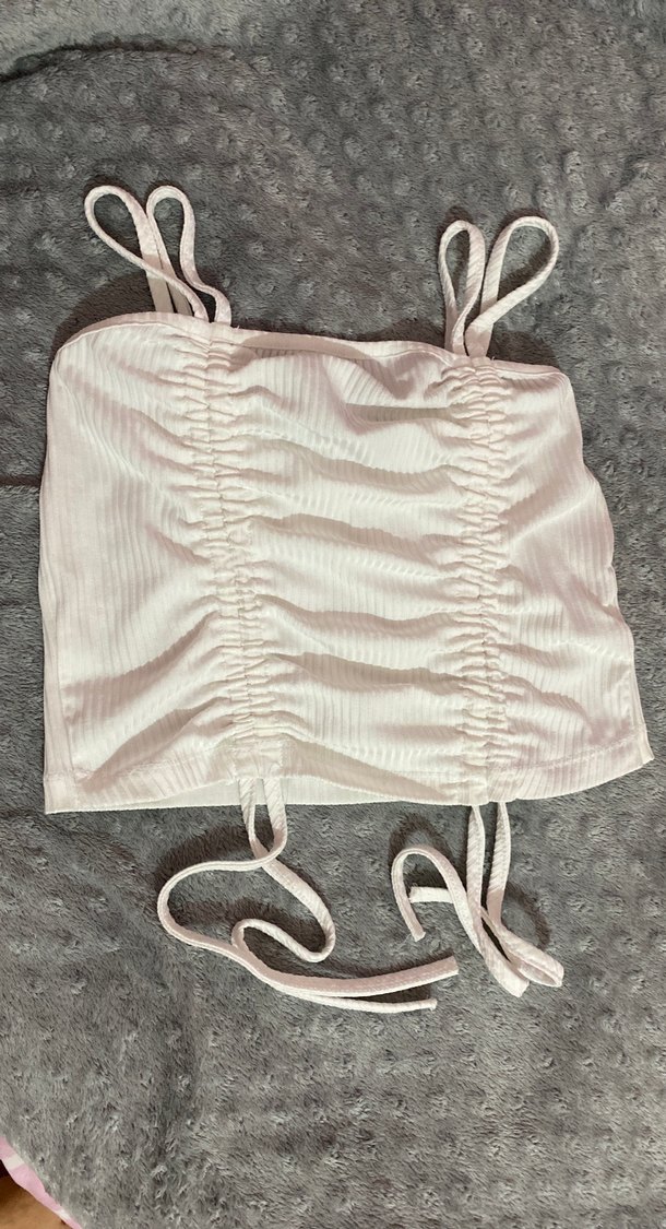 Yumuşak sentetik kumaştan yapılmış, askılı ve pilili detaya sahip beyaz, mini, vücuda oturan crop top. Trend sokak stili için uygun.