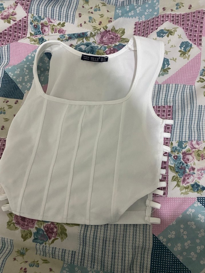 Yumuşak pamuktan üretilmiş beyaz straplez büstiyer, pilili detaylara sahip. Vücuda oturan kesimi ve midi uzunluğu ile şık bir sokak stili sunar. Kolsuz tasarım rahatlık sağlar. Tek sıkıntısı ipler kayıp hiç giyilmedi