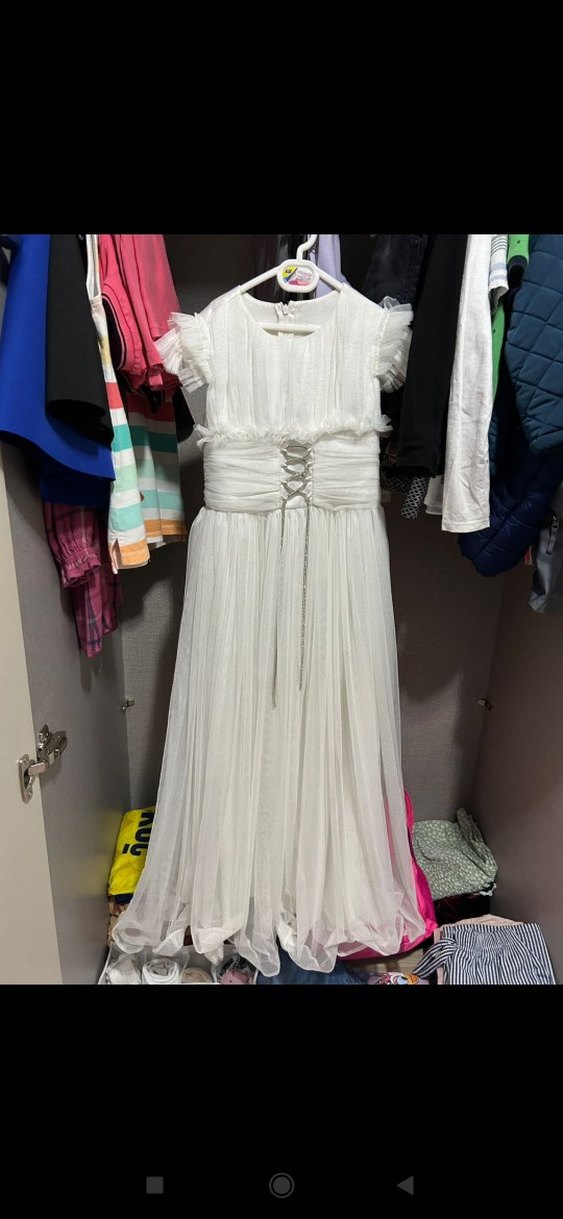 Beyaz, uzun pilili gelinlik; korsaj detaylı, fit kesim. İnce askılı kollar ve straplez yaka ile bohem tarzda şık bir seçim.