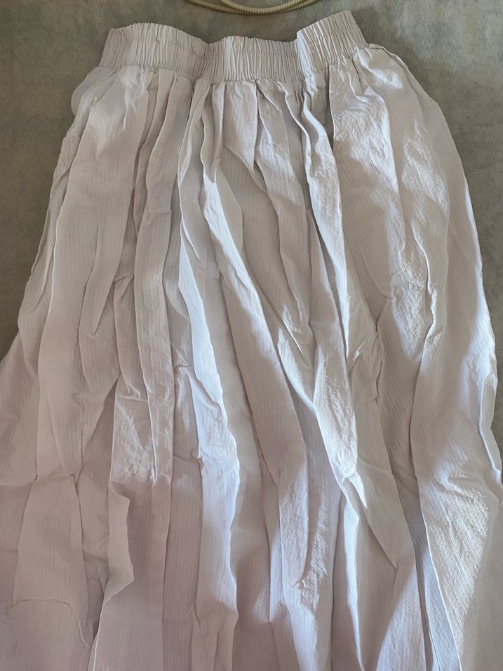 Beyaz uzun keten etek, pilili ve bol kesimlidir. Yumuşak kumaşıyla minimalist bohem tarzda günlük kullanıma uygundur.