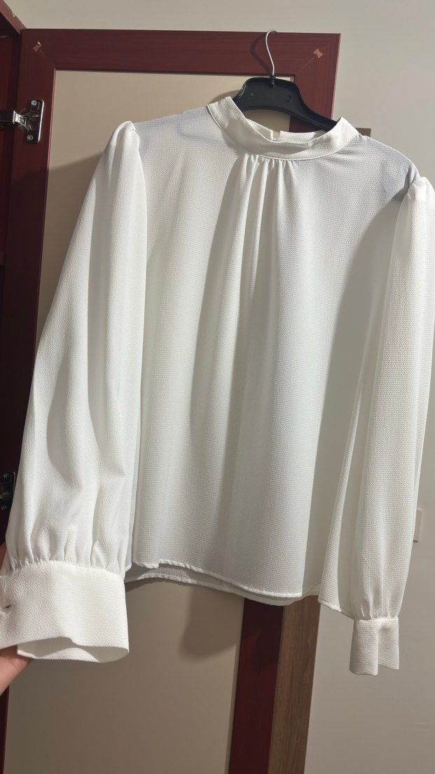 Beyaz renkte, yüksek yakalı ve pilili detaylara sahip uzun kollu kadın bluzudur. Rahat kesimi ve normal boyuyla ofis kullanımı için uygundur. Sentetik kumaştan yapılmıştır ve desensizdir.