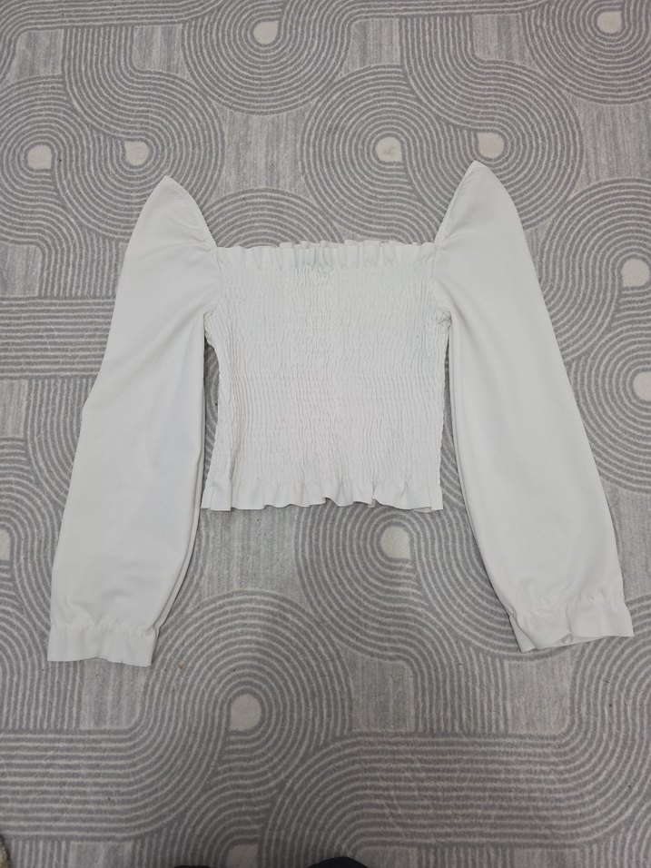 Beyaz, uzun kollu, tek renk pilili ve tekne yakalı, normal boyda, keten kumaştan kadın bluz. Günlük kullanıma uygundur.