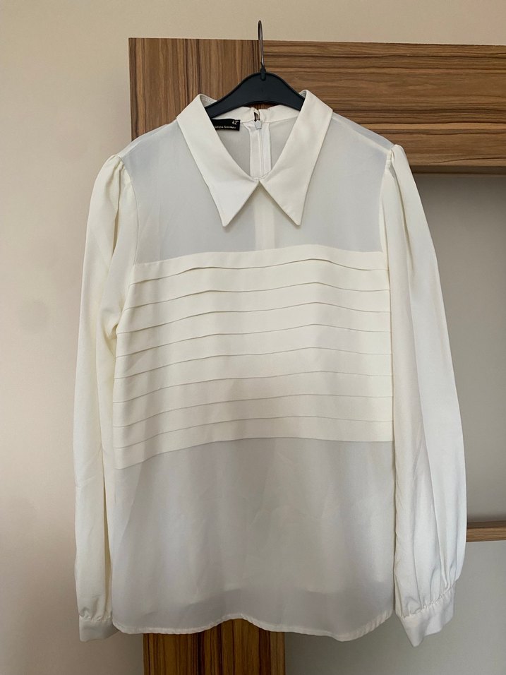 Beyaz renkli, yakalı ve ön kısmı pilili uzun kollu kadın gömleği. Hafif keten kumaştan, normal kesim, ofis veya günlük kullanıma uygun.