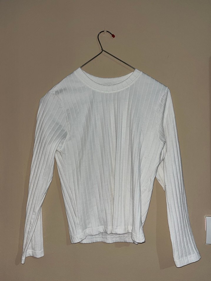 Beyaz, keten kumaştan yapılmış, uzun kollu, bisiklet yaka ve pilili detaylara sahip, vücuda oturan kadın kazak. Minimalist ve sokak stili, günlük kullanım için uygundur.