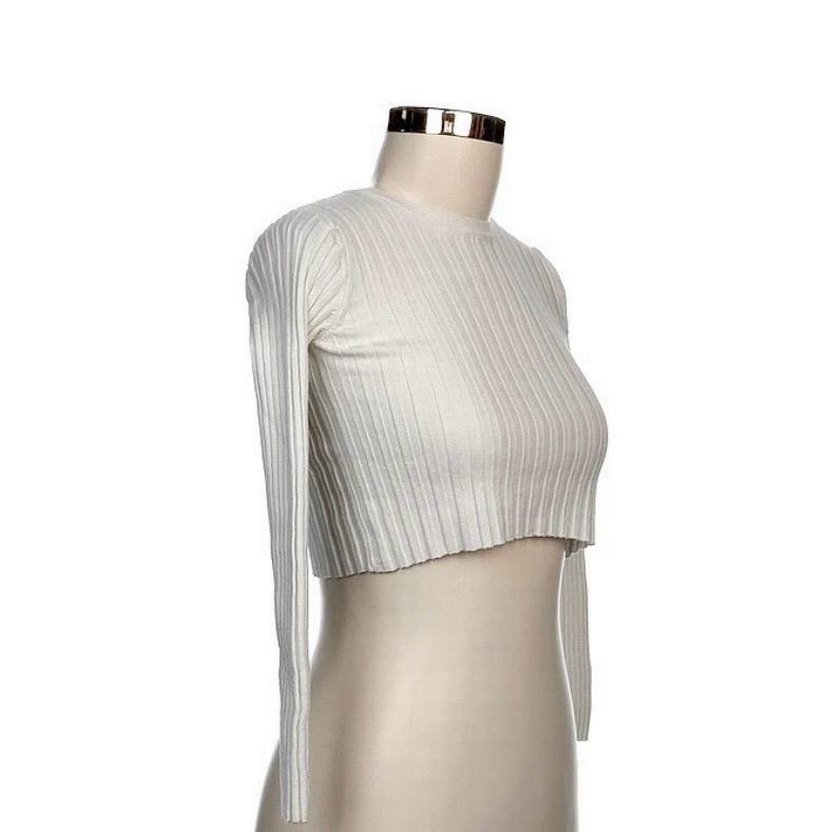 Beyaz triko kumaştan, uzun kollu ve yuvarlak yakalı, pilili dokulu, normal boyda ve vücuda oturan kadın kazak. Günlük kullanım için uygundur.