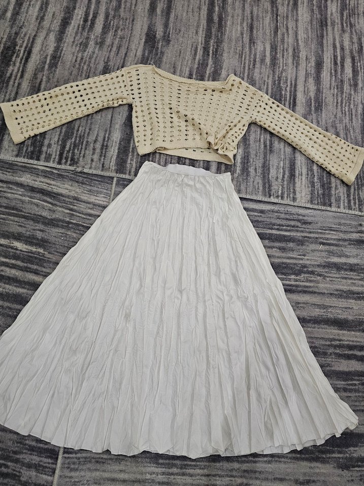 Beyaz, pilili, triko kumaştan uzun etek, bol kesimdir. Bohem ve retro tarzlara uygundur, düğün için idealdir.