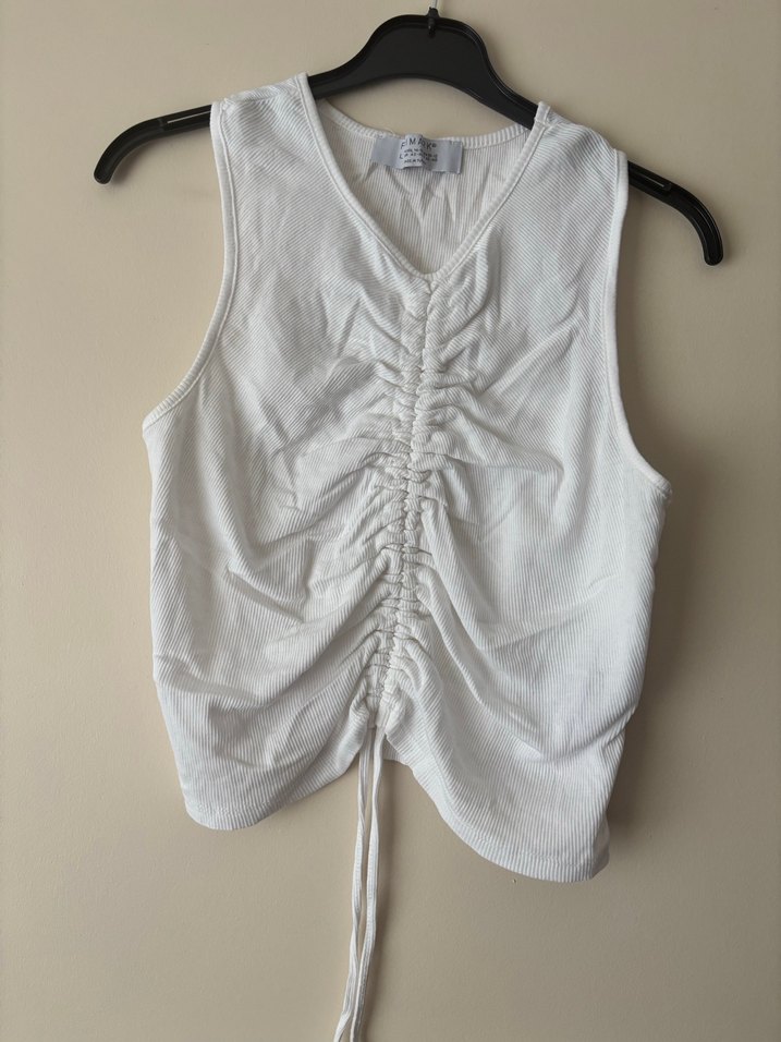 Beyaz kolsuz kadın atlet, V yaka ve ön kısmında pilili detaylara sahiptir. Fit kesim, günlük sokak stili için uygundur.