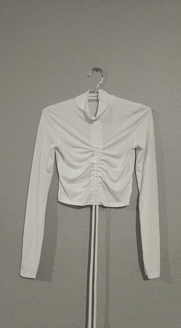 Beyaz renkte, yüksek yakalı ve uzun kollu kadın bluz. Yumuşak bir kumaştan, pilili detaylara sahip ve midi boyda, minimalist sokak stili için uygundur. Ürünün büzgü kısmında dikiş bilen birinin kolaylıkla halledebileceği bir dikiş sorunu var. Bu yüzden uygun fiyata ekliyorum.