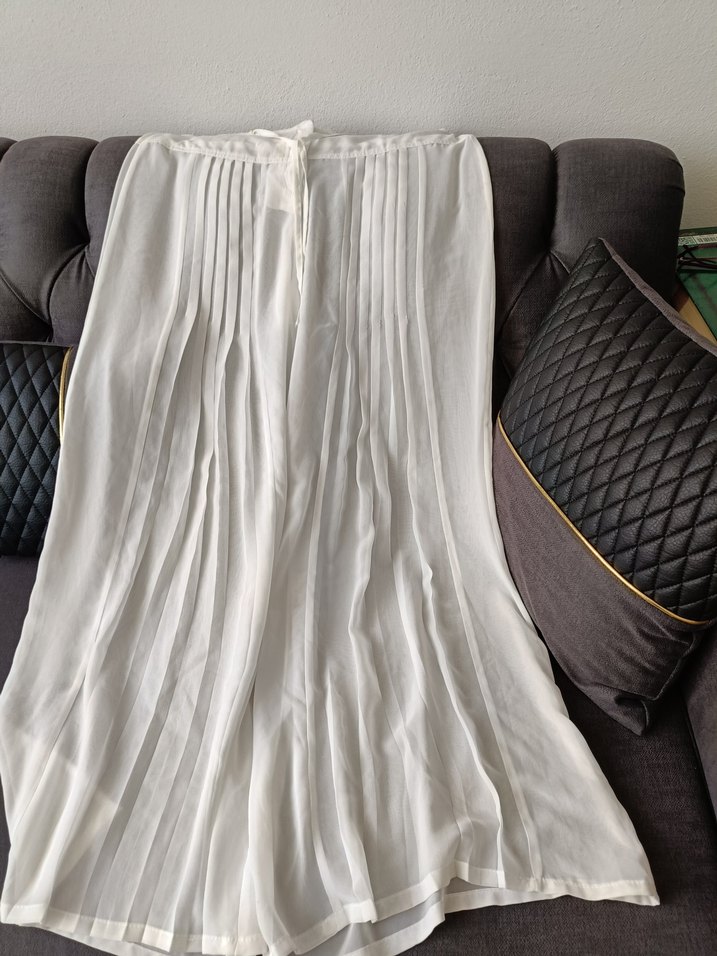 Beyaz, piliseli ve uzun kesime sahip bu kadın eteği, bol kesimli ve ipeksi dokulu kumaştan yapılmıştır. Bohem ve Paris tarzını yansıtır, günlük kullanım için uygundur. Ahben marka 40 beden astarsz tül pantolon geniş, uzunluk 1 metrep