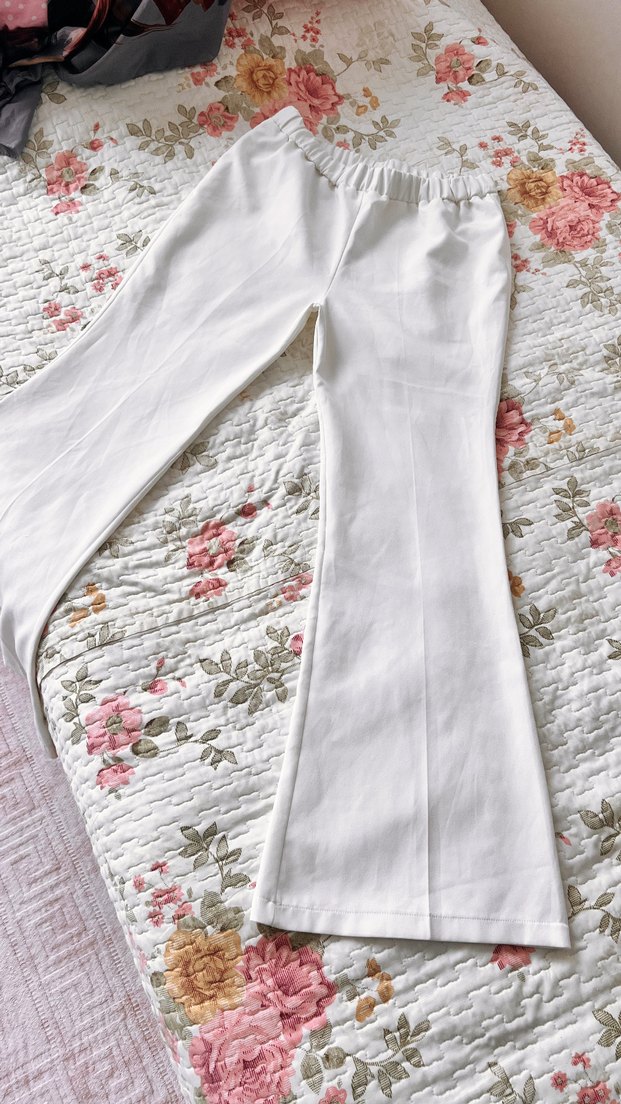 Beyaz kumaştan, piliseli ve normal boy midi pantolon. Rahat kesimli ve lastikli bel detaylı, günlük kullanım için uygun bohem tarzda.