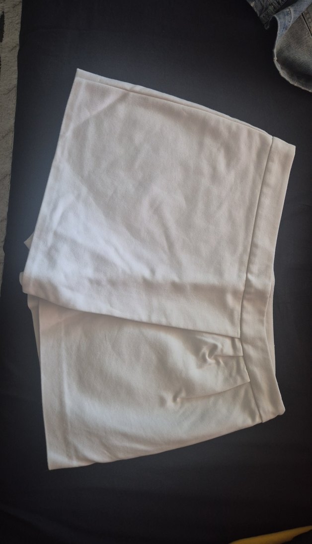 Beyaz, piliseli, midi boy kadın kumaş şort etek Regular fit ve minimalist streetwear tarzında, yumuşak sentetik kumaştan üretilmiştir. beli38 cm boyu 31 cm