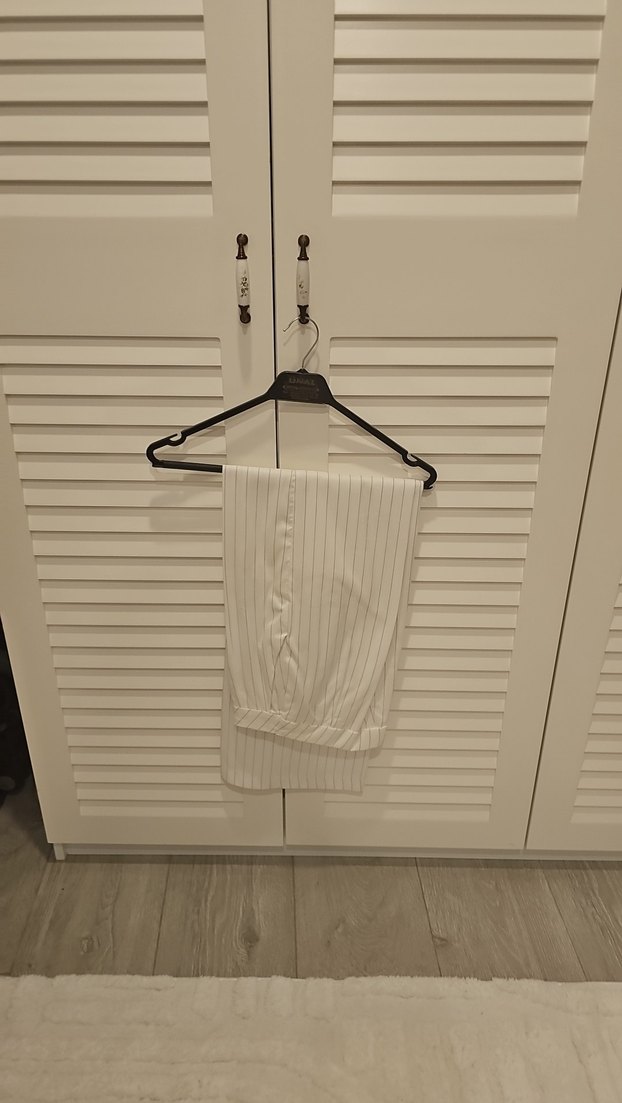 Beyaz piliseli keten kadın pantolon, normal boy ve regular fit kesim, minimal ve şık tasarım, günlük kullanım için uygundur.