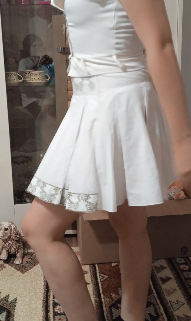 Beyaz piliseli mini etek, fitted kesim ve hafif süslemeli detaylarla. Yumuşak sentetik kumaştan üretilmiştir, şık ve modern bir görünüm sunar. 81 cm komple bel ölçüsü ,41 cm uzunluk