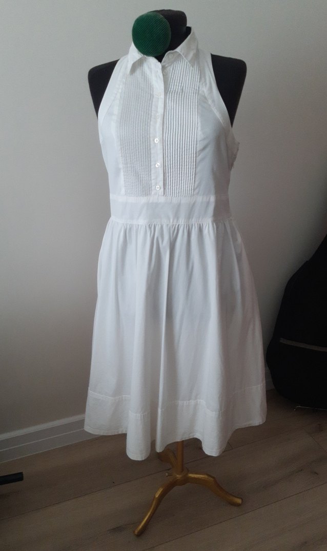 Beyaz, kolsuz, yüksek yakalı midi elbise. Pamuklu, piliseli ön detaylı, bol kesim ve bohem tarzda, günlük kullanım için uygun. Elbise XL fakat L beden de giyebilir