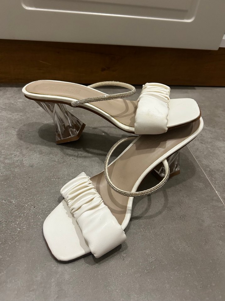 Beyaz piliseli bantlı ve şeffaf topuklu, klasik ve minimalist tarzda günlük kullanıma uygun kadın topuklu terlik. Nikahımda bir kez gıydım. Güzel ve rahattır.
