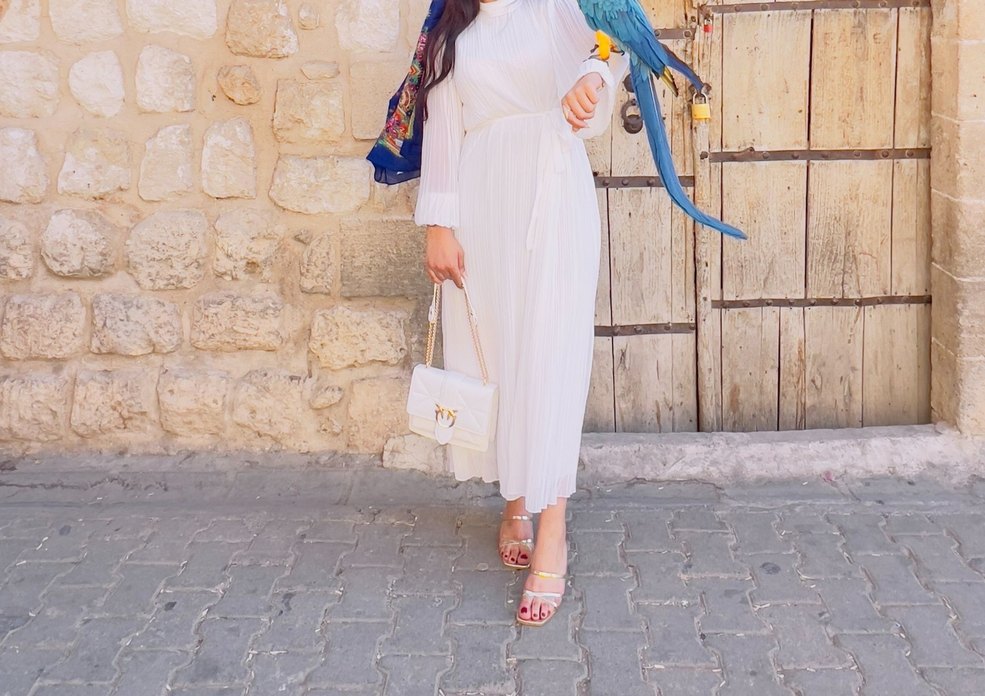 Beyaz renkli, bisiklet yaka ve piliseli tasarıma sahip uzun elbise. Gevşek kesimi, batik deseni ve salaş kolları ile sentetik kumaştan üretilmiştir. Trendy rahat stil için uygundur