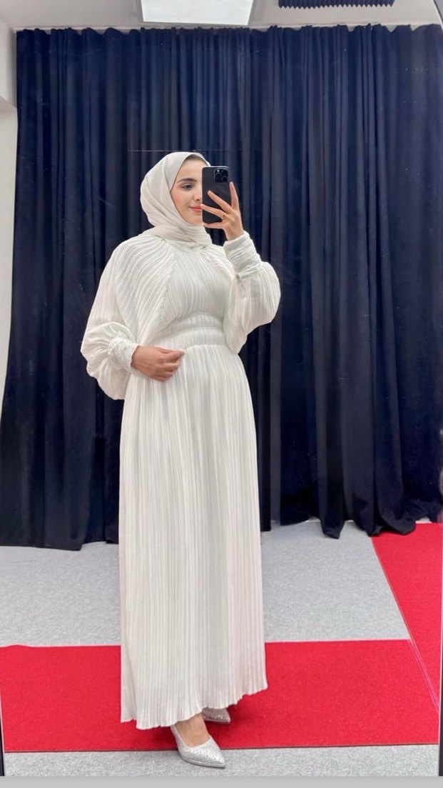 Yüksek yakalı, uzun kollu beyaz piliseli uzun elbise. Salaş kesimi ve yumuşak sentetik kumaşıyla sade sokak stili için uygun.