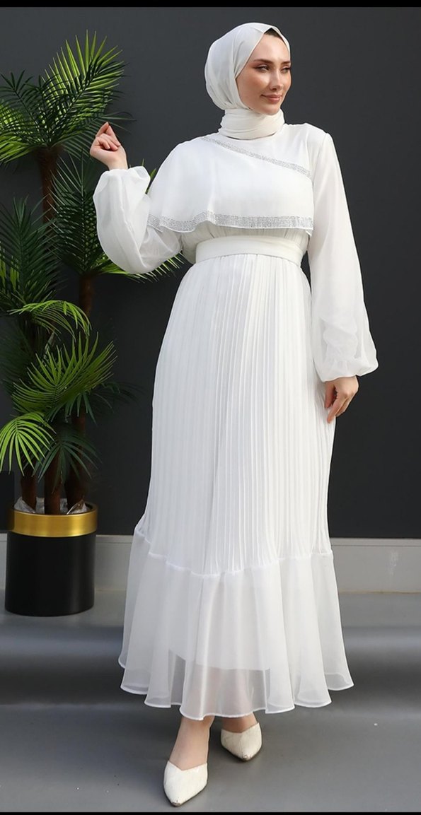 Beyaz Piliseli Uzun Tesettür Nikahlık