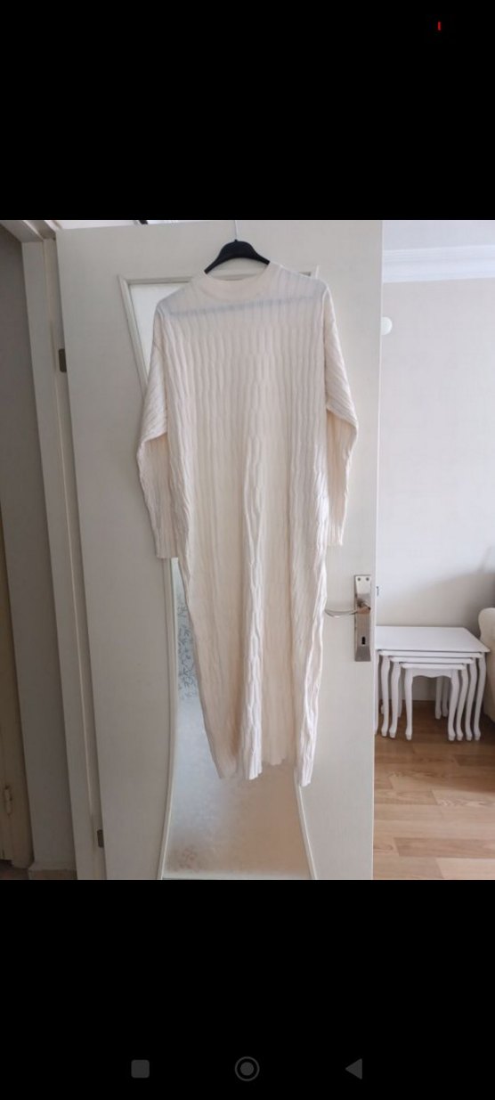 Beyaz renkte, piliseli uzun triko elbise. Boğazlı ve uzun kollu, rahat kesimiyle günlük kullanıma uygundur. bir defa kullanıldı