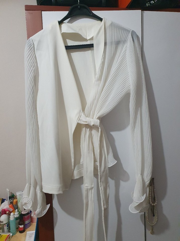 Beyaz piliseli uzun kollu, V yakalı ve bağlamalı detaylı kadın bluz. Hafif keten kumaştan, bol kesim ve midi boyda, bohem ve Paris tarzını yansıtır.