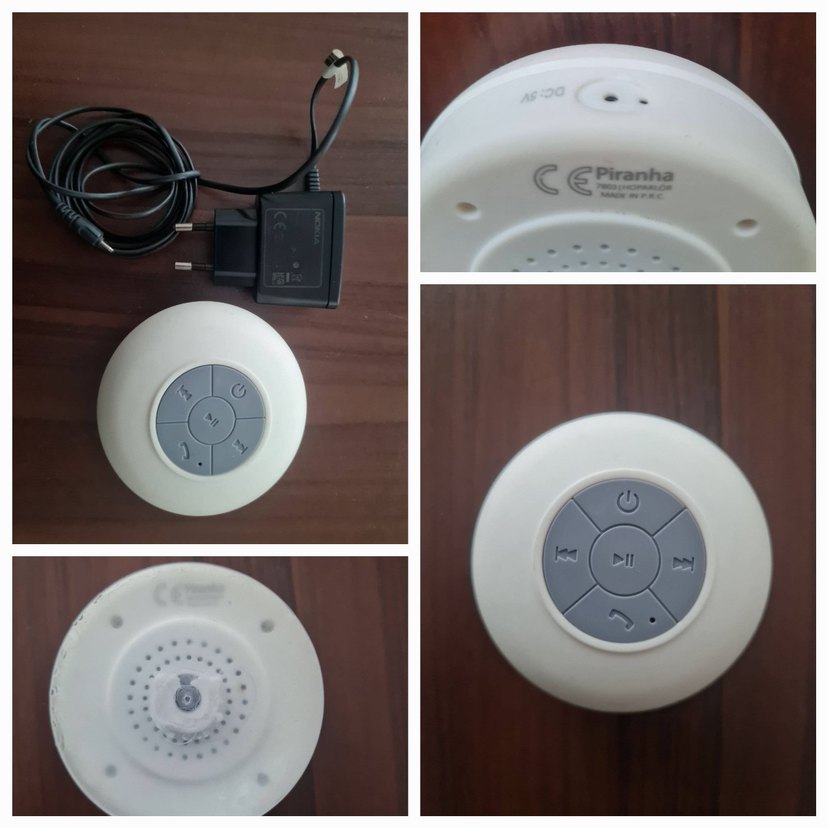 Yuvarlak tasarımlı beyaz Piranha Bluetooth hoparlör, üstte kontrol düğmeleri ve şarj cihazı ile birlikte. Kompakt ve taşınabilir. Banyo ve dușta rahatça müzik dinlemek için ideal Piranha marka Bluetooth hoparlör. Suya dayanıklı yapısı sayesinde sorunsuz bir kullanım sunar. Vantuzu zamanla biraz yıpranmıştır ancak hoparlörün kendisi temiz ve fonksiyonel olarak sorunsuzdur. Kablosu ile birlikte teslim edilecektir.