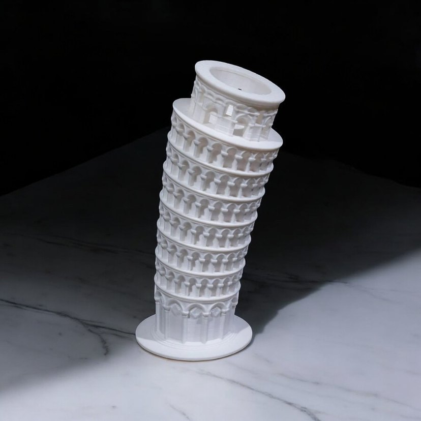 Bu beyaz figür, detaylı kemerler ve sütunlarla Pisa Kulesi'ni temsil eder. Açık renkte dekoratif bir üründür. ️ 3D PLA malzeme ile üretilmiştir