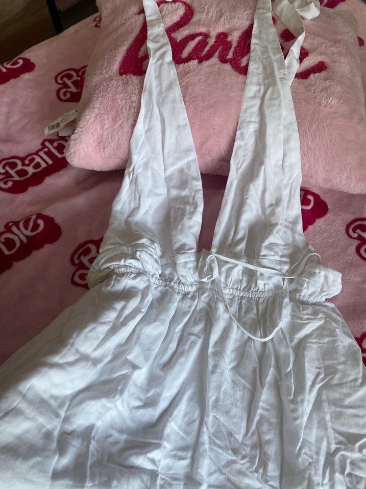 Ayarlanabilir askılı, yumuşak dokulu beyaz plaj elbisesi. Boyundan bağlamalı